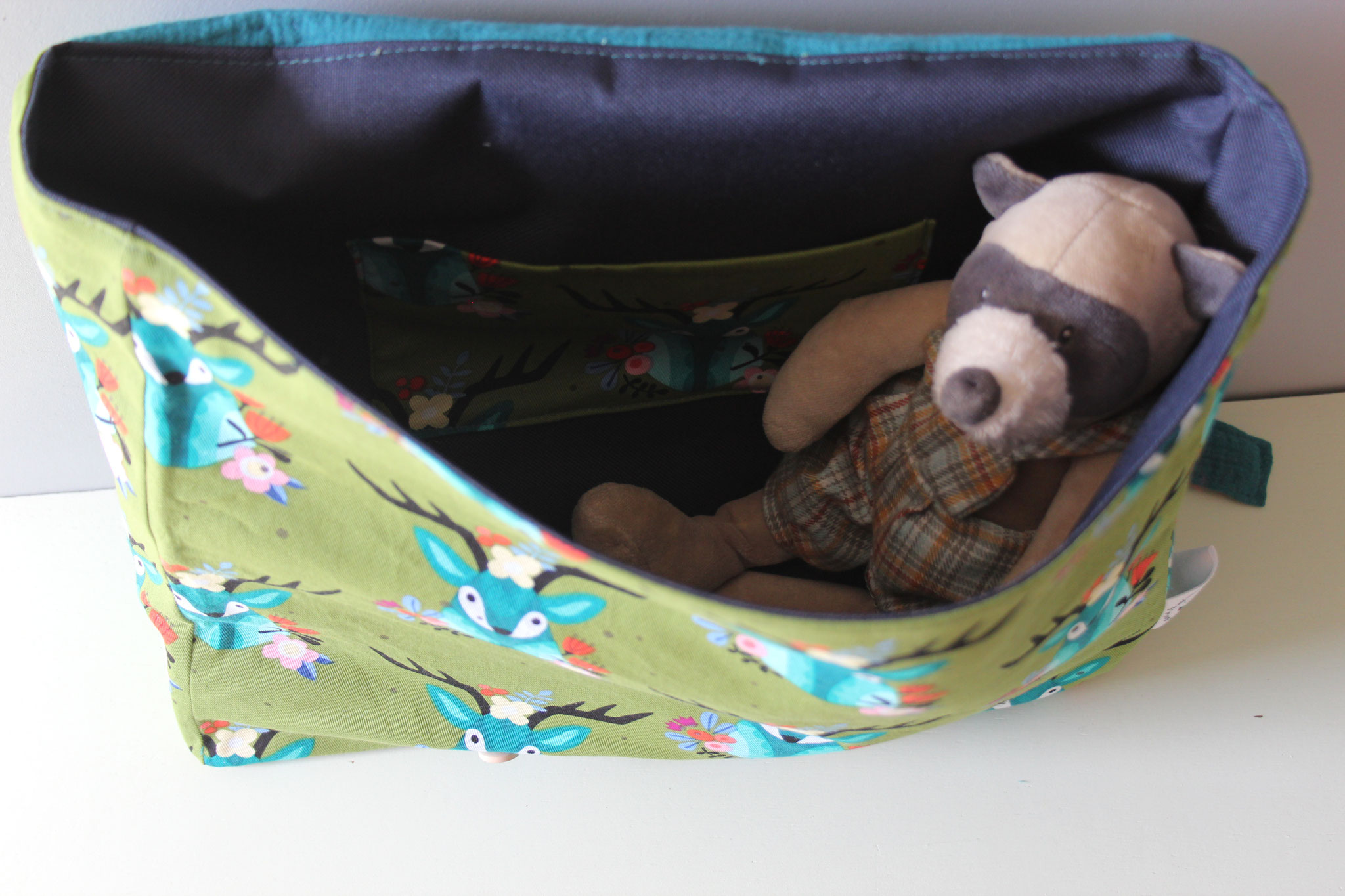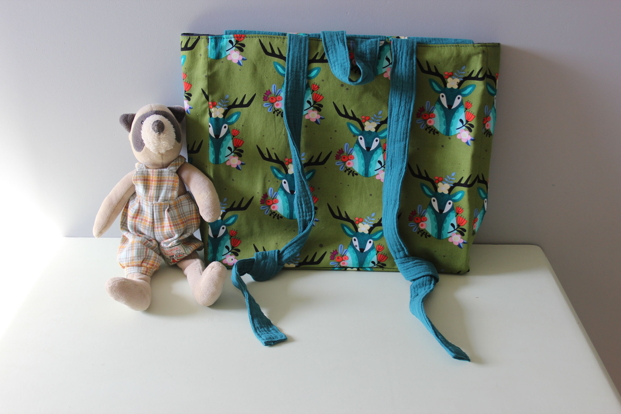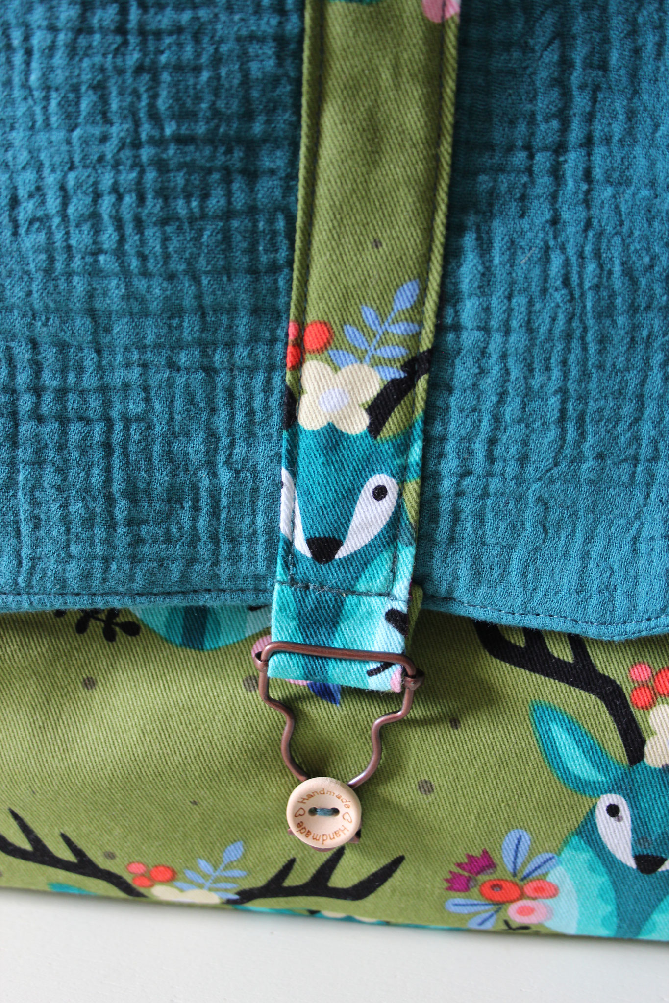 Les tissus extérieurs sont 100 % coton certifiés Oeko-tex, il s'agit de double gaze de couleur pétrole pour le rabat et les bretelles et de coton kaki imprimé avec des têtes de cerfs.