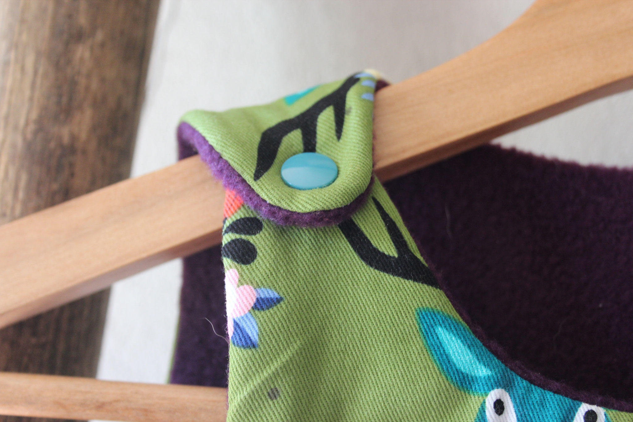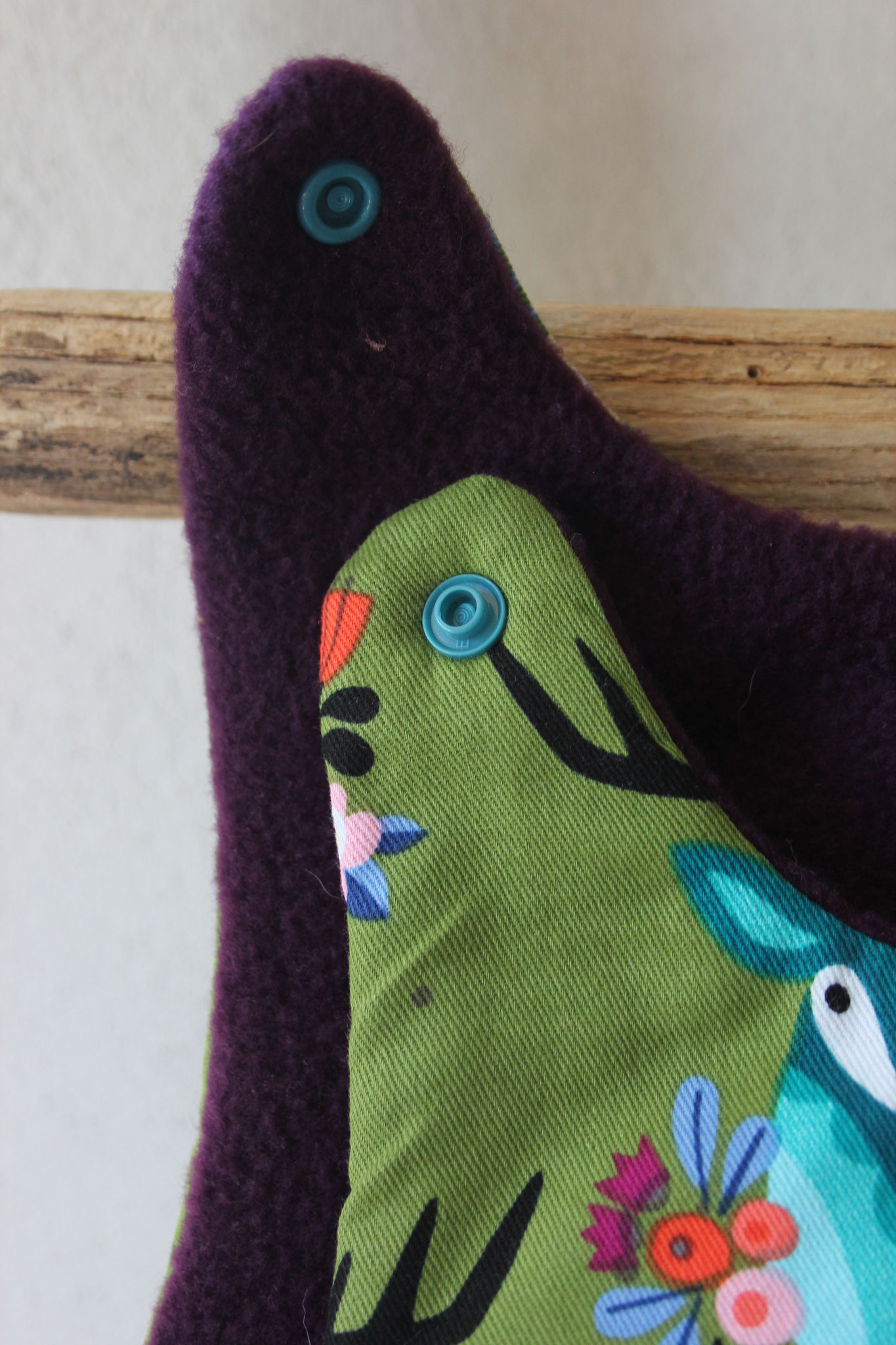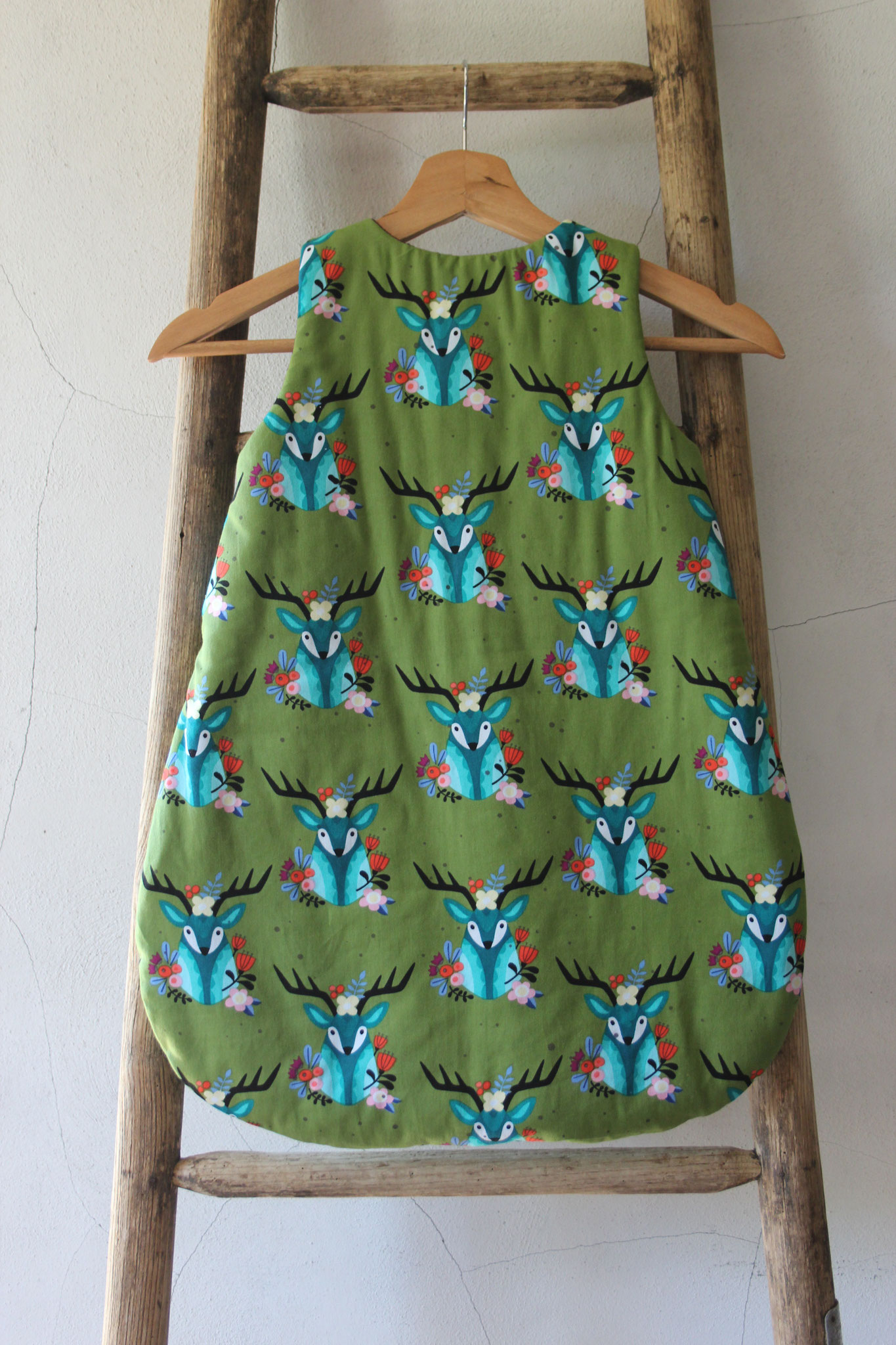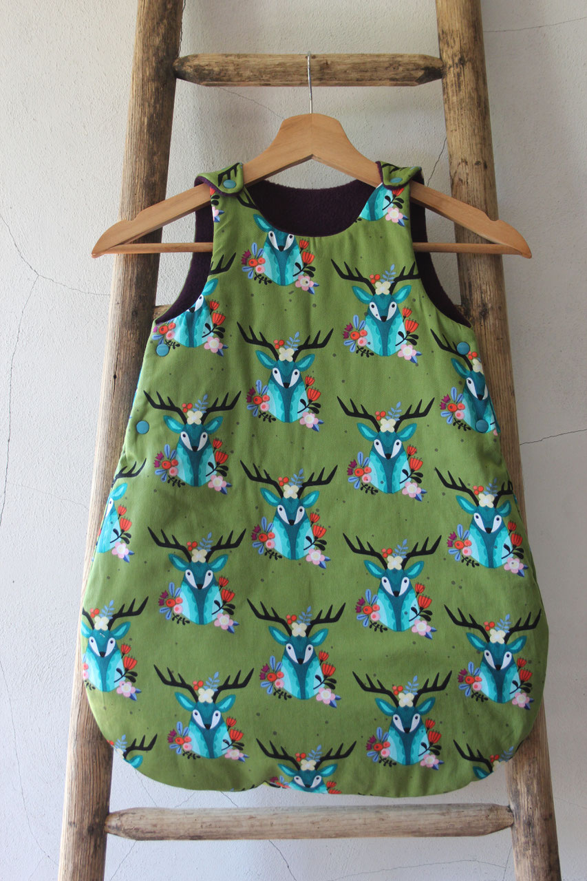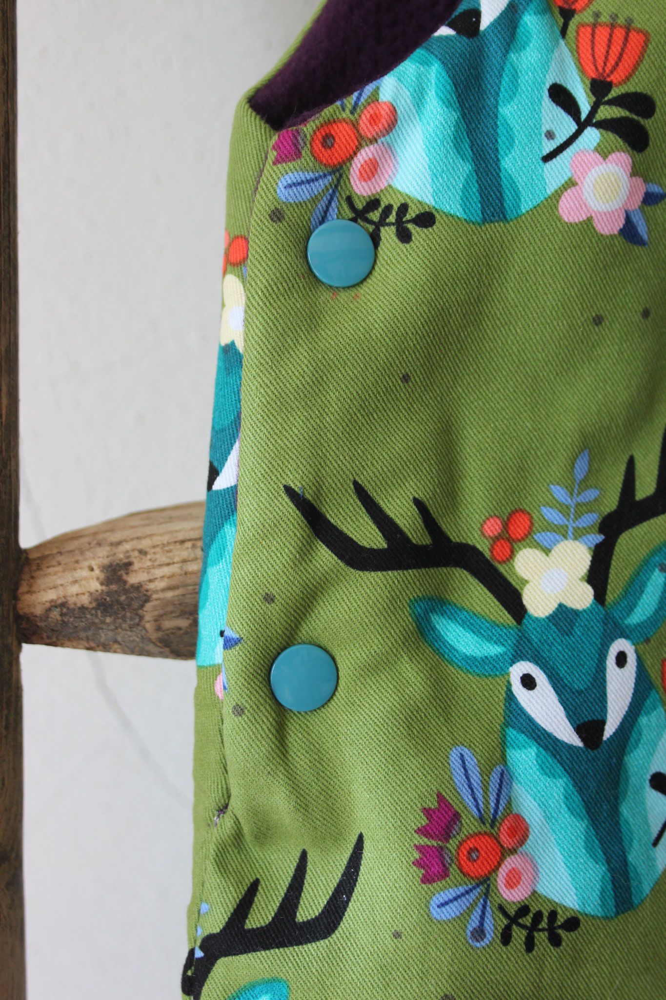 Elle est confectionnée dans un tissu en coton vert à motifs cerfs certifié oeko-tex pour l'extérieur et un tissu polaire de couleur prune pour l'intérieur, le tout doublé de molleton.